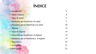 La salud y la higiene son fundamentales para la vida. La higiene previene enfermedades e infecciones mediante hábitos como lavarse las manos y mantenerse limpio. La salud incluye la salud física, mental y social. Elementos como una buena alimentación y actividad física benefician la salud, mientras que vicios como el alcohol y el tabaco la perjudican. Mantener buenos hábitos de higiene y salud es crucial para el bienestar.