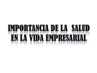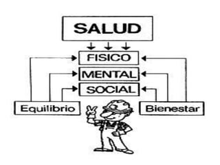 Este documento trata sobre la salud, el trabajo y los riesgos laborales. Discute cómo la salud es fundamental para disfrutar de una buena calidad de vida y cómo el trabajo contribuye al desarrollo personal al fomentar la confianza y autoestima. También describe cómo el ambiente laboral y los factores de riesgo pueden afectar la salud de los trabajadores, definiendo conceptos como incidentes, accidentes laborales y enfermedades profesionales.