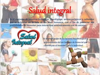 La salud integral incluye la salud emocional, física, mental y espiritual. La salud emocional se refiere al control de las emociones básicas como el amor, miedo, rabia, tristeza y alegría. La salud física requiere ejercicio y nutrición adecuados. La salud mental depende del pensamiento positivo o negativo. La salud espiritual se alimenta de creencias y la búsqueda de un ser supremo.