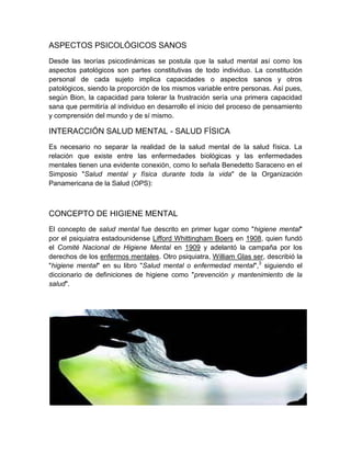 La salud mental se refiere al estado de equilibrio entre una persona y su entorno que garantiza su bienestar y calidad de vida. No existe una definición oficial, ya que está influenciada por factores culturales y subjetivos. La observación del comportamiento diario es clave para evaluar la salud mental de una persona en áreas como el manejo del estrés y las relaciones interpersonales. La salud mental y física están interconectadas, y ambas son importantes en todas las etapas de la vida.