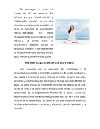 La salud mental se define como un estado de equilibrio entre una persona y su entorno que garantiza su participación laboral e intelectual para alcanzar el bienestar. No existe una definición oficial de salud mental debido a diferencias culturales. Aunque la ausencia de un trastorno mental no indica necesariamente salud mental, y sufrir un trastorno no impide disfrutar de bienestar. La salud mental es importante a todas las edades para manejar el estrés y tomar decisiones, y los problemas de salud mental representan alrededor del 15% de la c