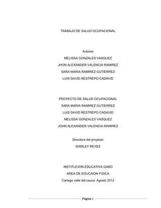 Este documento trata sobre el trabajo de salud ocupacional realizado por un grupo de estudiantes de la Institución Educativa GABO. El documento incluye la historia y evolución de la salud ocupacional en Colombia, los factores que determinan la relación entre trabajo, salud y ambiente, y la clasificación de riesgos y factores de riesgo.