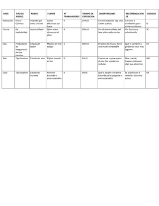El documento resume 5 áreas de una casa (habitación, cocina, sala, cosa) y los riesgos identificados en cada una. En la habitación hay cables eléctricos sueltos que representan riesgo de incendio. En la cocina sale mal olor del alcantarillado. En la sala hay madera en mal estado en el techo y el piso se vuelve liso cuando lo trapean. La escalera no tiene baranda ni antiresbaladilla. Se recomienda cortar los cables, verificar el alcantarillado, cambiar la madera del techo, advertir sobre el