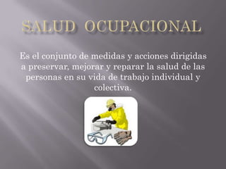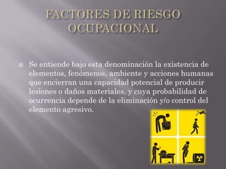 Este documento describe los conceptos y procesos fundamentales de la salud ocupacional y la prevención de riesgos laborales. Define términos como riesgo ocupacional, riesgo profesional, inspección de seguridad e higiene ocupacional, y describe los pasos del proceso de prevención de riesgos que incluyen la inspección de áreas, evaluación de riesgos y control de riesgos. También menciona algunas actividades económicas comunes y los riesgos asociados.