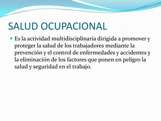La salud ocupacional promueve y protege la salud de los trabajadores mediante la prevención de enfermedades y accidentes laborales. Se define como la disciplina que busca el bienestar de los empleados en sus lugares de trabajo. Los factores de riesgo son elementos que pueden dañar la salud de los trabajadores. El sistema de riesgos profesionales establece normas para prevenir daños a la salud y seguridad de los trabajadores.