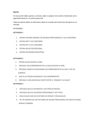 El documento presenta una serie de videos sobre la importancia de la salud y seguridad industrial, incluyendo videos sobre accidentes laborales reales y explicativos. Luego propone varias actividades relacionadas con conceptos como riesgos profesionales, accidentes de trabajo, factores de riesgo y prevención, para finalizar con la solicitud de aportar material adicional sobre seguridad industrial.