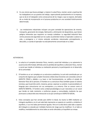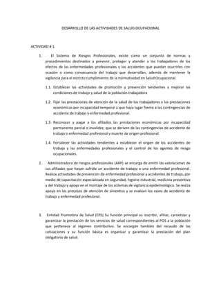 El documento describe las actividades relacionadas con la salud ocupacional. Estas incluyen 1) establecer actividades de promoción y prevención para mejorar las condiciones de trabajo y salud de los trabajadores, 2) fijar las prestaciones de atención de salud de los trabajadores y prestaciones económicas por incapacidad, 3) reconocer y pagar prestaciones económicas por incapacidad permanente o invalidez derivadas de accidentes laborales o enfermedades profesionales. También se describen las funciones de la Administradora