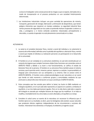 Este documento describe las actividades relacionadas con el desarrollo de la salud ocupacional. Presenta seis actividades que detallan el sistema de riesgos profesionales, las funciones de la administradora de riesgos profesionales y la entidad promotora de salud, conceptos sobre salud ocupacional, factores de riesgo en el ambiente laboral, prevención de riesgos y accidentes de trabajo.