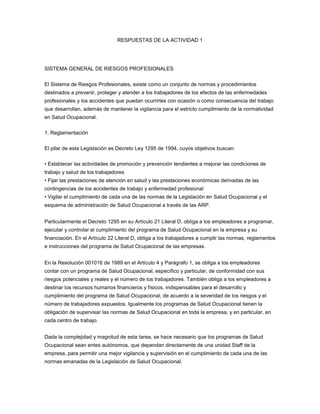 El documento describe el Sistema General de Riesgos Profesionales en Colombia. Este sistema incluye normas y procedimientos para prevenir enfermedades y accidentes laborales, y brindar atención a los trabajadores. El sistema está conformado por el Ministerio de Trabajo, el Consejo Nacional de Riesgos Profesionales, entidades como las ARP y las EPS, y tiene como objetivo proteger la salud y seguridad de los trabajadores.