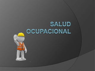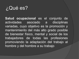 El documento describe la salud ocupacional, que busca promover el bienestar físico, mental y social de los trabajadores mediante la prevención de enfermedades laborales y la protección de los riesgos a la salud en el lugar de trabajo. La salud ocupacional tiene como objetivos prevenir enfermedades, proteger a los trabajadores de riesgos, y establecer condiciones de trabajo adaptadas a las capacidades de los trabajadores. Todos en la organización, incluidos los empleados y la gerencia, deben participar para lograr un programa exitoso