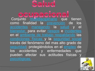 El documento describe la evolución de la salud ocupacional en Colombia a través de la historia. Comenzó en la época prehispánica cuando los indígenas buscaban proteger su salud y seguridad a través de la organización social. Más tarde, durante la Edad Media y Moderna, el estado y las leyes empezaron a responsabilizarse por la protección y bienestar de los trabajadores. El documento resume las principales leyes y decretos de salud ocupacional en Colombia y los organismos internacionales relacionados con la seguridad laboral.