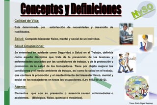 Este documento presenta conceptos clave sobre salud ocupacional, incluyendo definiciones de accidente de trabajo, enfermedad profesional, agentes de riesgo, y roles y responsabilidades del empleador, trabajador y COPASO. Además, explica los elementos básicos de un programa de salud ocupacional y clasifica diferentes factores de riesgo ocupacionales.