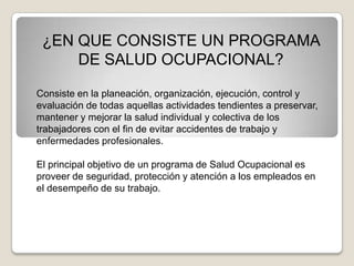 El documento habla sobre la salud ocupacional y su importancia para proteger y mejorar la salud física, mental y social de los trabajadores. Explica que un programa de salud ocupacional consiste en planificar, organizar y evaluar actividades para preservar la salud de los trabajadores y prevenir accidentes y enfermedades laborales. Además, resume brevemente la historia de la salud ocupacional en Colombia y las leyes y decretos más importantes sobre el tema.