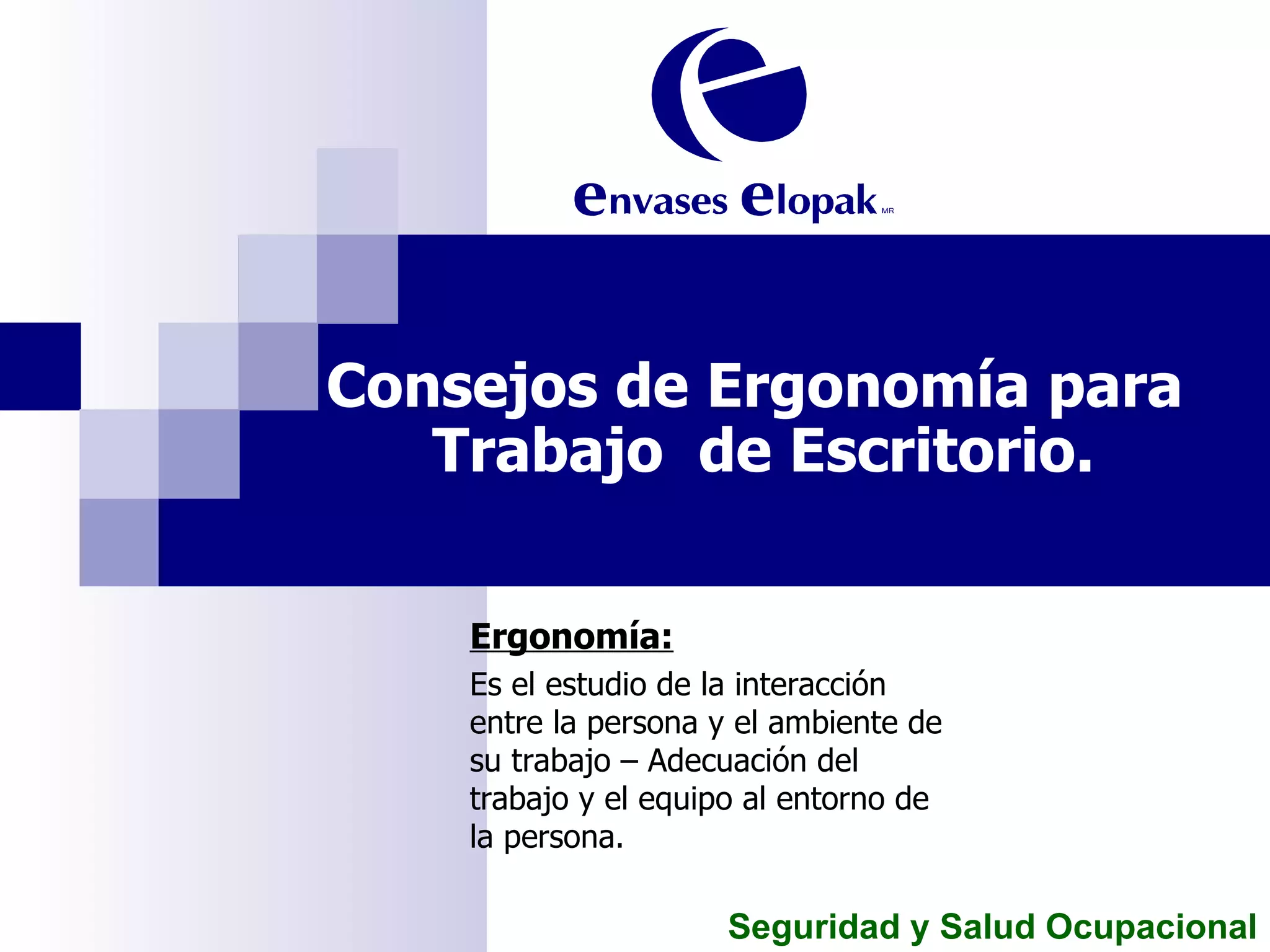 El documento ofrece consejos de ergonomía para el trabajo de escritorio. Explica que la ergonomía estudia la interacción entre la persona y su ambiente de trabajo, y recomienda adecuar el equipo y el trabajo al entorno de la persona para evitar lesiones. Además, incluye ejemplos de posiciones incorrectas y una oficina ideal, así como ejercicios sencillos para realizar en la oficina cada hora con el fin de minimizar los riesgos de lesiones.