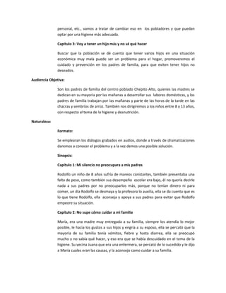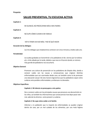 Este documento describe un proyecto de radio para promover la salud preventiva en una comunidad rural. El proyecto consta de tres capítulos dramatizados de 5.5 minutos cada uno sobre temas como la desnutrición infantil, la higiene doméstica y la planificación familiar. Los capítulos se transmitirán los viernes y sábados para llegar a la mayor audiencia. El objetivo es enseñar a los pobladores sobre prevención de enfermedades y embarazos no deseados a través de historias que presentan un problema