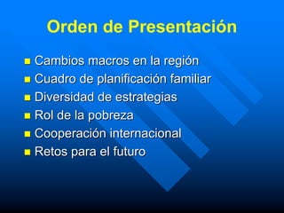 Este documento resume la situación actual de la salud reproductiva y la planificación familiar en América Latina y el Caribe. Ha habido mejoras notables en los indicadores de salud, aunque la mortalidad materna sigue siendo alta. Existe una gran diversidad entre los países en términos de uso de anticonceptivos, opciones de métodos y sistemas de entrega de servicios. La pobreza y las desigualdades siguen siendo barreras importantes para el acceso a la atención de salud reproductiva. Se recomienda mejorar la