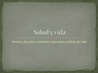 El documento presenta una empresa llamada Salud y Vida que brinda servicios relacionados con la obesidad como entrenamiento, asesoría nutricional, rutinas de gimnasio y cirugía bariátrica a bajo costo. La empresa está presidida por el Dr. Kevin Hernández Vides y cuenta con psicólogos, doctores, abogados, fisiculturistas y nutricionistas asociados. El objetivo de la empresa se enfoca en la salud a través del deporte, mientras que el proyecto de aula del presentador se centrará