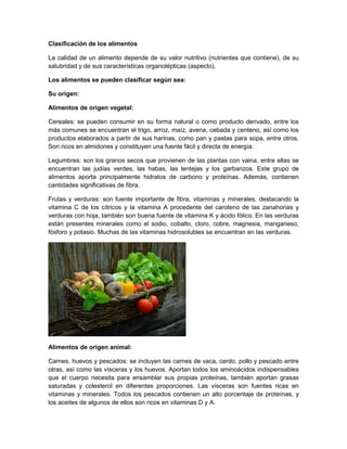 El documento clasifica y describe los diferentes tipos de alimentos según su origen, nutrientes, grupos y métodos de cocción y conservación. Explica que los alimentos se pueden clasificar en alimentos de origen vegetal como cereales, legumbres, frutas y verduras, y de origen animal como carnes, huevos, pescados y leche. También describe los siete grupos de alimentos y sus funciones, así como factores relacionados con hábitos alimenticios, digestión, lactancia y ablactación.