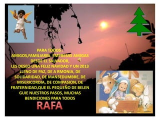 Un mensaje desea a amigos, familiares y empresas una feliz Navidad y un próspero 2013 lleno de paz, armonía, solidaridad, mansedumbre, misericordia, compasión y fraternidad, y que el niño Jesús guíe sus pasos con muchas bendiciones para todos.