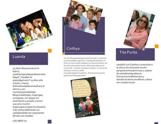 Este documento contiene los recuerdos y sentimientos de varios familiares hacia las cumpleañeras Carolina y Sofía. Recuerdan su nacimiento, infancia, personalidades distintas pero llenas de amor, y cómo han crecido para convertirse en unas jóvenes inteligentes y sensibles que todos quieren y están orgullosos.