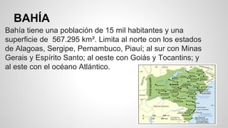 Bahía es un estado brasileño con una población de 15 mil habitantes ubicado en la costa este de Brasil. La capital y ciudad más grande es Salvador, que se divide en la ciudad alta y baja separadas por valles profundos. Los principales puntos turísticos incluyen el ascensor Lacerda en Salvador y las islas Itiparica y Morro de São Paulo. Bahía tiene un clima tropical cálido y húmedo debido a su cercanía al océano, y su gastronomía se ve influenciada por las culturas africanas. Las playas