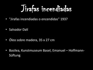 La obra Jirafas incendiadas de Salvador Dalí de 1937 representa jirafas en llamas que simbolizan el absurdo de la existencia humana en el mundo moderno. La pintura sugiere que detrás de la apariencia bella del ser humano se esconde algo inesperado, angustiante e inquietante, representado por los cajones en el pecho y la pierna que supuestamente permiten el acceso al interior del ser. A pesar del peligro de las llamas, las jirafas se muestran serenas al no tener conciencia de su prop