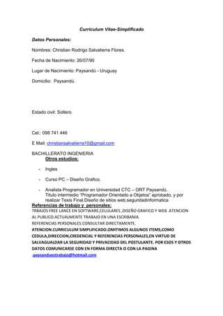 Este currículum vitae resume la información personal y profesional de Christian Rodrigo Salvatierra Flores. Nacido en 1990 en Paysandú, Uruguay, Salvatierra actualmente vive solo en Paysandú y estudió ingeniería e inglés. Obtuvo un título intermedio de "Programador Orientado a Objetos" de la Universidad CTC-ORT Paysandú y trabajó de manera independiente en diseño web, seguridad informática y atención al cliente. Actualmente trabaja en una escribanía y ofrece referencias personales bajo consulta direct