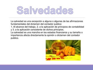 Este documento presenta una clasificación de tres tipos de salvedades que un contador público puede incluir en un dictamen: 1) por limitaciones al alcance del trabajo del auditor, 2) por faltas o desviaciones en la aplicación de los principios de contabilidad, y 3) por cambios en la aplicación de dichos principios (inconsistencia). También explica que cuando las salvedades afectan parcialmente los estados financieros pero no en su conjunto, el contador debe emitir un dictamen con salvedades.