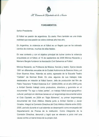 Este documento propone declarar de interés de la Cámara de Diputados el libro "Salvemos al Fútbol, 10 años de lucha" escrito por Mónica Nizzardo y Mariano Bergés. El libro describe la historia y trabajo de la asociación civil Salvemos al Fútbol, fundada en 2006 para luchar contra la violencia en el fútbol. A lo largo de 10 años, la organización ha abordado este problema desde perspectivas legales, de comunicación, investigación e intervención solidaria. El libro también incluye contribuc