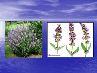 Este documento describe el cultivo de la salvia (Salvia officinalis L.), incluyendo su sistema, morfología, requerimientos de clima y suelo, métodos de propagación, cultivo, recolección, plagas y enfermedades. La salvia tiene usos medicinales, cosméticos y culinarios debido a sus principios activos como el alcanfor y cineol en su aceite esencial.