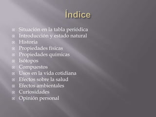 El samario es un metal blanco grisáceo que se encuentra de forma natural en minerales como la monacita. Fue descubierto en 1879 y se usa principalmente para fabricar potentes imanes y como catalizador químico. Puede ser peligroso si se inhala, ya que puede causar embolias pulmonares, y se acumula en el medio ambiente y los organismos vivos con el tiempo.