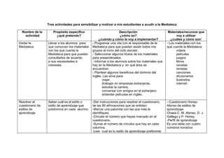 Este documento presenta tres actividades para motivar a los estudiantes a asistir a la Mediateca. La primera actividad consiste en llevar a los estudiantes a una visita guiada de la Mediateca para presentarles los diferentes materiales disponibles. La segunda actividad implica aplicar un cuestionario de estilos de aprendizaje para que los estudiantes descubran su estilo preferido. La tercera actividad es resolver un cuestionario de inteligencias múltiples para identificar las fortalezas y áreas de oportunidad de cada estudiante. El objetivo general
