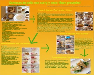 Este documento proporciona una receta para hacer samosas de pollo con curry y coco. La receta incluye ingredientes como pollo, mayonesa, mostaza, curry, coco y cacahuetes para el relleno. Las instrucciones explican cómo preparar el relleno mezclando estos ingredientes y cómo rellenar, doblar y hornear las obleas de masa para formar las samosas. Finalmente, la receta sugiere servir las samosas calientes con una salsa de yogur y decorar con rúcula o hojas verdes.