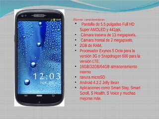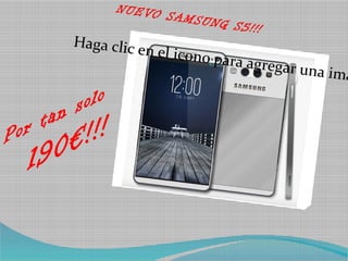 Este documento promociona el Samsung Galaxy S5 por solo 190 euros, destacando sus mejoras respecto al S4 como una pantalla más grande de 5.5 pulgadas, cámaras trasera de 13 megapíxeles y frontal de 2 megapíxeles, 2GB de RAM, procesador Exynos o Snapdragon, y almacenamiento de 16/32/64GB. También señala que el S5 es más rápido y potente que el S4 con una batería más grande de 2600mAh y velocidad de descarga más alta.