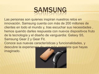 El documento describe el nuevo teléfono Samsung Galaxy S5, destacando sus características principales como una pantalla SuperAMOLED Full HD de 5.1 pulgadas, cámara de 16 megapíxeles, resistencia al agua y al polvo, escáner de huellas dactilares y conectividad WiFi y 4G mantenidas. El Galaxy S5 comenzará a distribuirse a partir del 11 de abril con un precio estimado de $11,000 en la Argentina.