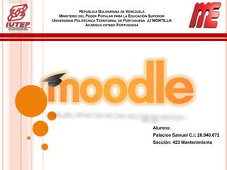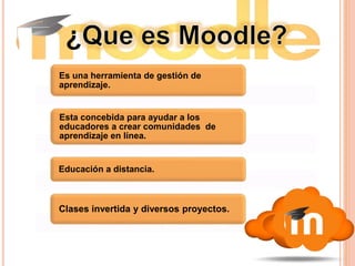 Este documento describe las características y funcionalidades del sistema de gestión de aprendizaje Moodle. Moodle es un software de código abierto diseñado para ayudar a los educadores a crear comunidades de aprendizaje en línea. El documento explica los principales módulos de Moodle como tareas, encuestas, diarios, wikis y recursos, y describe los diferentes roles de usuario como administrador, creador de cursos, profesor y estudiante.