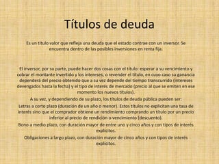 Los títulos de deuda reflejan una deuda contraída por el estado con un inversor. El inversor puede esperar a su vencimiento para cobrar el capital más intereses, o revender el título dependiendo de su precio en el mercado. Existen letras a corto plazo, bonos a medio plazo y obligaciones a largo plazo, que otorgan a los inversores derechos sobre la deuda del emisor.
