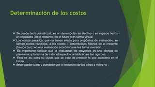 Este documento presenta información sobre la determinación y evaluación de costos en la formulación de un proyecto. Explica los diferentes tipos de costos como costos de producción, administración, ventas, inversión inicial, depreciaciones, capital de trabajo, punto de equilibrio, estado de resultados y balance general. También cubre temas como financiamiento y cronograma de inversiones.