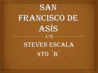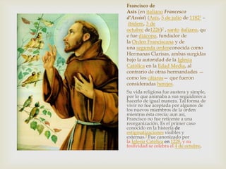 El documento describe la vida de San Francisco de Asís, un santo católico italiano que fundó la Orden Franciscana. Comenzó como un joven acomodado pero tuvo una conversión religiosa que lo llevó a dedicar su vida a vivir en pobreza y servir a los demás. Fundó dos órdenes religiosas que se expandieron por toda Europa predicando la pobreza, la castidad y la obediencia. Murió en 1226 y fue canonizado poco después.