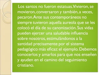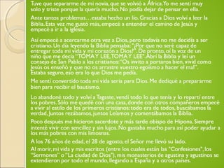 Este documento describe la vida de San Agustín de Hipona, incluyendo su nacimiento en el año 354, su conversión al cristianismo en 386 luego de una vida de búsqueda de la verdad, y su obra como obispo de Hipona hasta su muerte en 430. Explica sus principales enseñanzas sobre la vocación universal a la santidad, la caridad como centro de la perfección cristiana, y la necesidad de la gracia divina y la oración para crecer en el amor de Dios.
