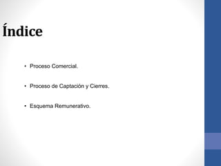 Este documento describe el proceso de captación y cierre de propiedades inmobiliarias, así como los esquemas remunerativos. Explica los pasos para conseguir bases de datos de propiedades, programar citas con propietarios, realizar sesiones fotográficas, cerrar acuerdos e ingresar compromisos en la agenda. También detalla dos modelos de distribución de comisiones entre la agencia y los asesores.