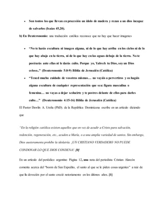 El documento discute la devoción católica a San Expedito, a quien se le pide ayuda para cosas "imposibles". Critica esta práctica como una forma de idolatría, ya que solo Dios puede hacer lo imposible. La Biblia prohíbe la adoración de imágenes y la oración a otros que no sean Dios. Los cristianos solo deben orar a Jesús, quien es el único mediador entre Dios y los hombres.