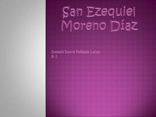 San Ezequiel Moreno y Díaz fue un obispo agustino español nacido en 1848 que profesó en la Orden de Agustinos Recoletos en 1865. Sirvió como misionero en Filipinas durante 15 años antes de regresar a España, donde restauró la orden agustina y sus misiones en Colombia. Fue nombrado Vicario Apostólico de Casanare en 1893 y obispo de Pasto en 1895, donde se distinguió por su fidelidad a la Iglesia y celo apostólico hasta su muerte en 1906. Fue beat