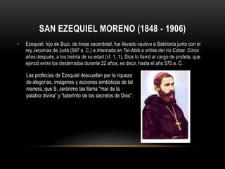 El documento presenta información biográfica sobre San Ezequiel Moreno, un sacerdote y obispo agustino español que vivió en el siglo XIX. Fue un misionero reconocido en Filipinas y posteriormente obispo en Colombia, donde se destacó por su caridad. Se le atribuyen varios milagros y curaciones, especialmente de cáncer. Fue beatificado en 1975 y canonizado en 1992.