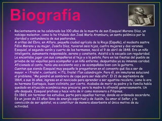 San Ezequiel Moreno fue un obispo y misionero español del siglo XIX. Nació en 1848 en Alfaro, La Rioja, España. Ingresó como fraile agustino recoleto a los 16 años y fue enviado como misionero a Filipinas a los 23 años. Más tarde fue nombrado obispo de Casanare, Colombia, donde realizó arduo trabajo misionero a pesar de las dificultades. Posteriormente fue nombrado obispo de Pasto, Colombia, donde sirvió con dedicación durante 10 años defendiendo los valores crist