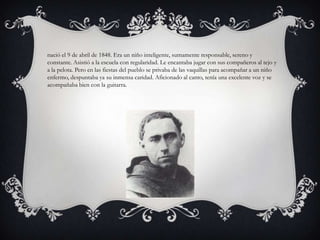 Ezequiel Moreno nació en 1848 en España. Sirvió como sacerdote agustino en Colombia y fue nombrado obispo de Pasto en 1896, donde sirvió con dedicación durante 10 años defendiendo los valores cristianos. Murió en 1906 con fama de santidad. Fue beatificado en 1975 y canonizado en 1992 por su labor misionera e incansable servicio a la Iglesia.