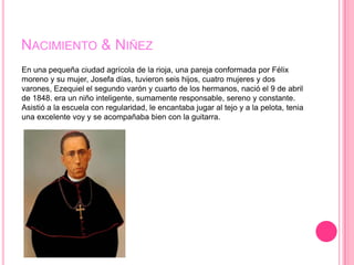 Ezequiel Moreno nació en 1848 en España. Se unió a la orden agustina a los 16 años y fue ordenado sacerdote en 1869. Sirvió como sacerdote y misionero en Filipinas y Colombia, ayudando a los pobres y enfermos. En 1885 se convirtió en prior de un noviciado, donde influyó espiritualmente en los jóvenes. Murió de cáncer en 1906 a los 58 años. Un hombre atribuye a San Ezequiel Moreno haber curado el cáncer de su pareja después de rezarle durante
