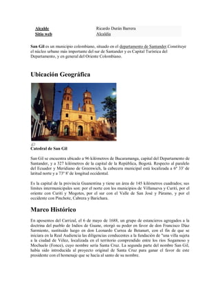San Gil es un municipio colombiano ubicado en el departamento de Santander. Cuenta con una población de aproximadamente 75,000 habitantes y una temperatura promedio de 24°C. Su economía se basa principalmente en la agricultura, ganadería e industria. Ofrece varias atracciones turísticas como deportes de aventura y el Parque "El Gallineral".
