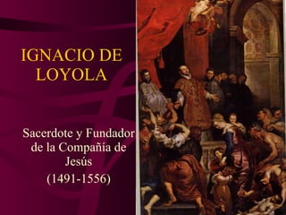 Ignacio de Loyola (1491-1556) fue un sacerdote español y fundador de la Compañía de Jesús. Nació en una época de grandes cambios como el Renacimiento y el descubrimiento de América. Fue herido en la batalla de Pamplona en 1521 lo que le llevó a leer textos religiosos y tener experiencias espirituales que cambiaron su vida. Junto con siete compañeros fundó la Compañía de Jesús en 1540, dedicada a la educación y las misiones, con el objetivo de servir