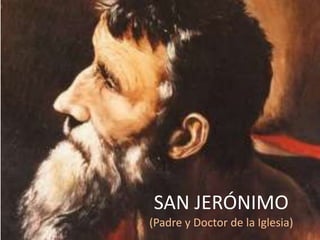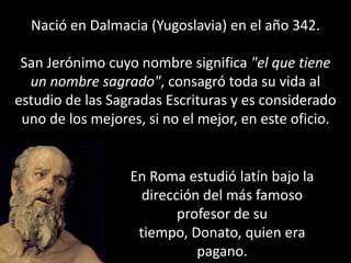 San Jerónimo nació en 342 en Dalmacia y dedicó su vida al estudio de las Escrituras. Tradujo la Biblia al latín (la Vulgata) para la Iglesia Católica. Pasó sus últimos 35 años en una gruta en Belén, donde fundó conventos y atrajo seguidores, antes de morir a los 80 años siendo reconocido como patrono de los estudios bíblicos.